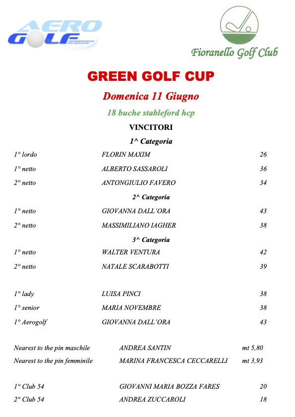 Complimenti ai nostri Soci che si sono classificati nelle prime posizioni in 1^ e in 2^ categoria ed in particolare complimenti al bel 43 realizzato da Giovanna Dall’Ora che oltre a vincere il 1° netto in 2^ categoria, si è aggiudicata il 1° netto AeroGolf portando a casa la scatola di Callaway Supersoft offerta da Costa Crociere e ha guadagnato le 500 miglia nautiche che l’avvicinano all’imbarco sulla Costa Smeraldo il 27 ottobre.